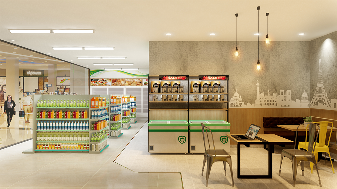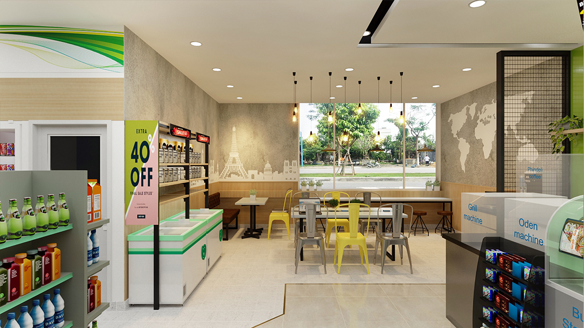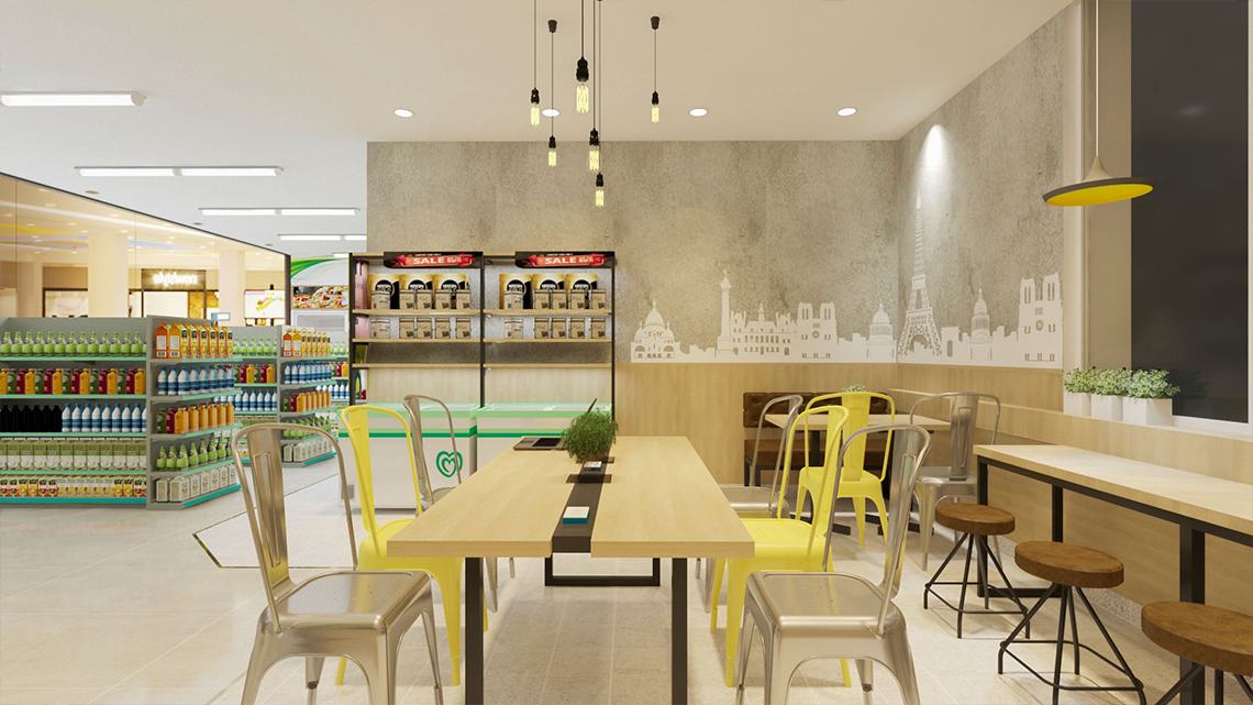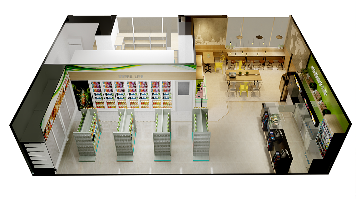 Chúng tôi đã thực hiện Hợp đồng thiết kế ý tường cho cửa hàng Bs Mart Theo mô hình cafe and shop