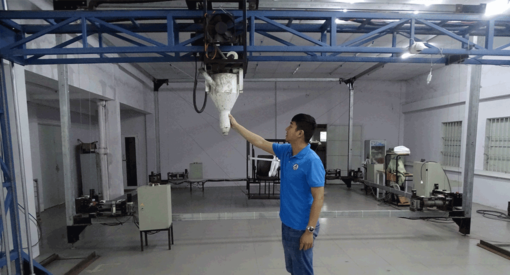 Máy in 3D dùng cho thi công ngôi nhà do nhóm tự phát triển hai năm trước. Máy có ba bộ phân chính: hệ khung đỡ, đầu in và tủ điều khiển. Đầu in 3D (màu trắng) hoạt động theo lập trình của máy tính