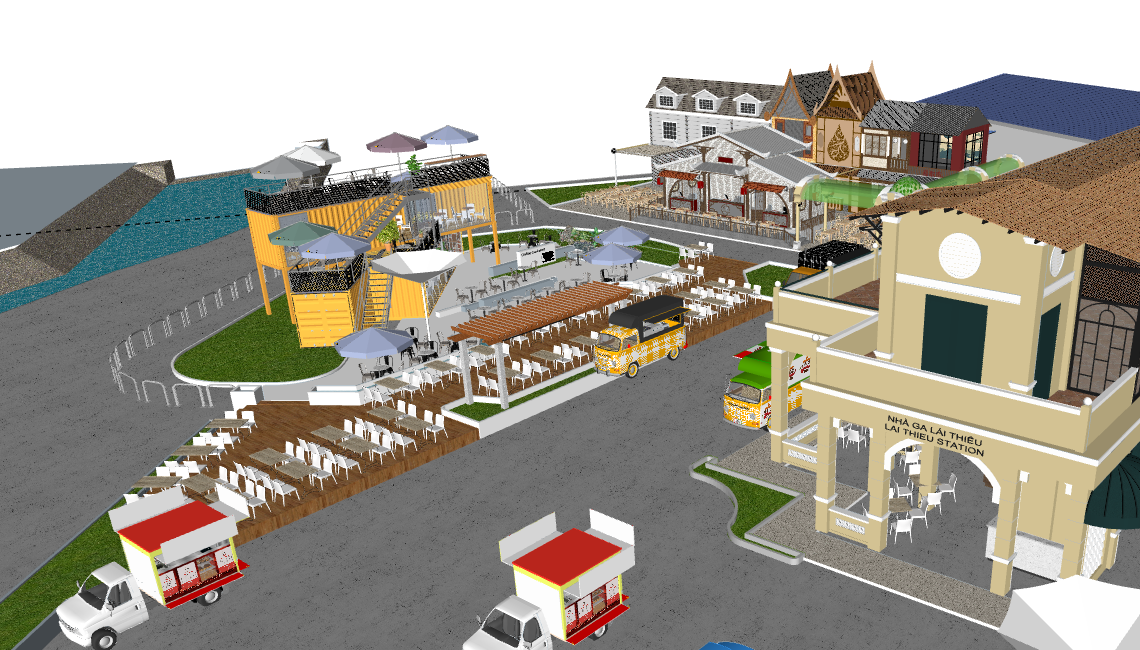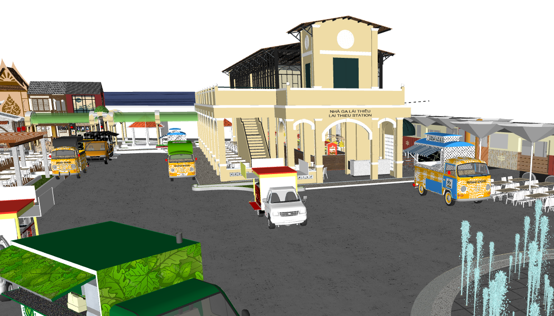 i hài hòa với Khu nhà Ga Lái Thiêu, đồng thời bố trí cảnh quan xen kẽ. Khách hàng gần như bước vào một thế giới ẩm thực hoàn toàn khách biệt và mới lạ.